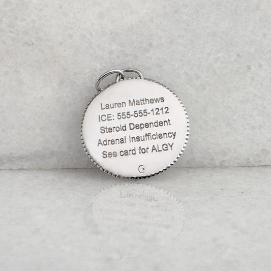 All of our medical jewelry has a one year warranty and arrives laser engraved with your personalized vital medical information, for clear and elegant access to your critical information in an emergency.