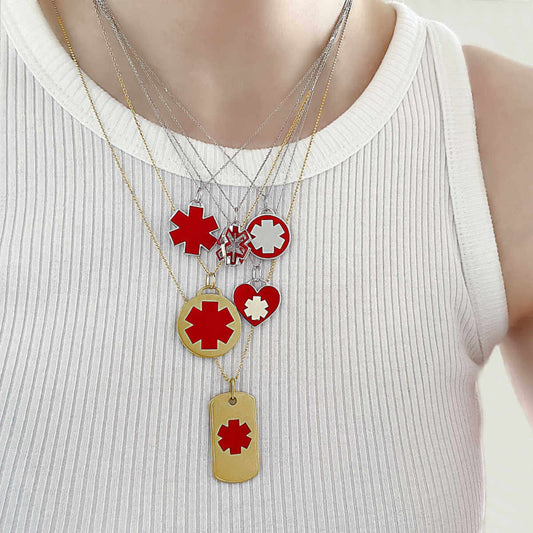 Elevate your safety with our designer collection of stylish medical ID jewelry, dedicated to ensuring that your crucial medical information is readily accessible to first responders in any emergency.