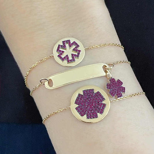 Our stylish gold medical ID bracelets are crafted in hypoallergenic solid yellow gold or white gold, with a glowing high polish finish. They feature the star of life symbol (recognized by first responders in an emergency) fashioned in sparkling pavé diamonds, gemstones, and fine enamel.